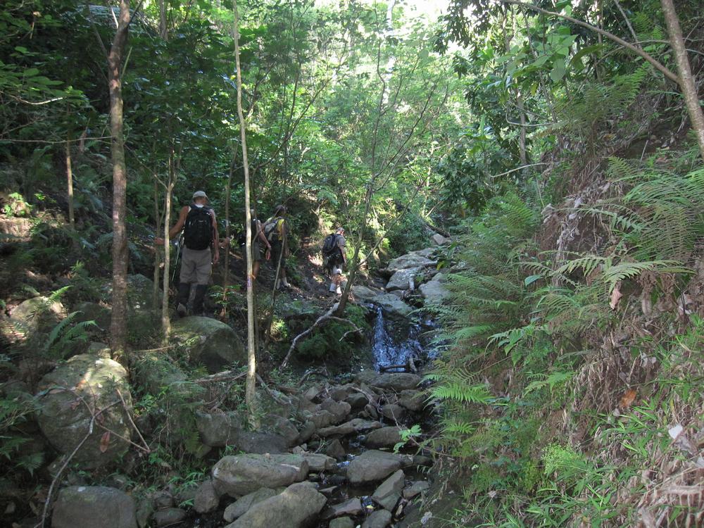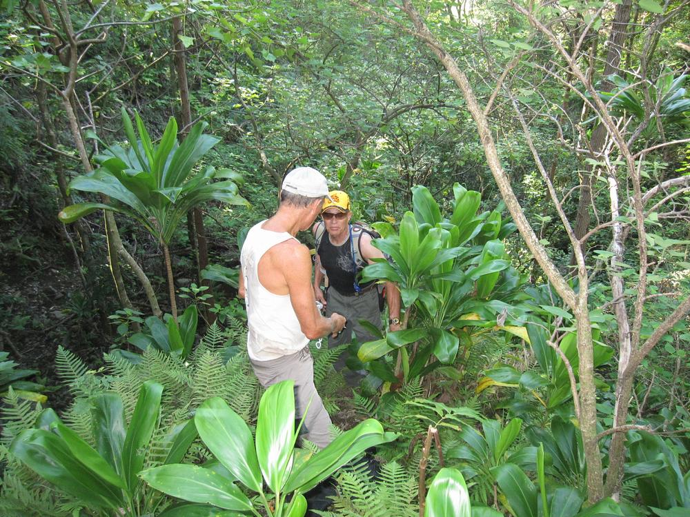 Going up a steep, narrow ridge Joseph and Alan talk about something.