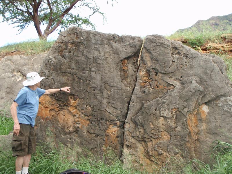 After visiting the Ahu we walked across a grass field and when down into the Ka`iahi stream bed to look as some huge slabs of sand stone w/petroglyph cut into the soft rock.
