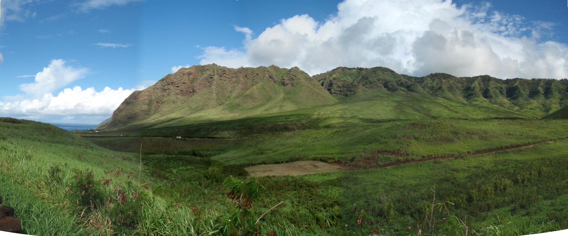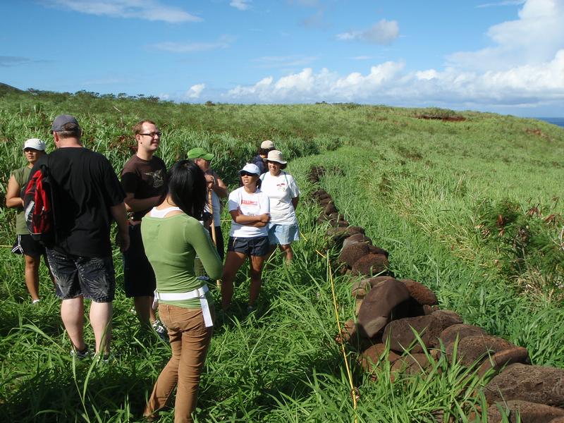 A few hundred feet down the trail from the piko rock was a rough stone wall running for a few hundred feet along the edge of a gulch. Two theories on why it is there. One a cattle wall to keep them from wandering down the steep slope, my guess. One of the archeologists along with us also suggested that it might have been built to slow down water running into the stream below. This might catch some silt and also perhaps lessen the erosion of the slope.