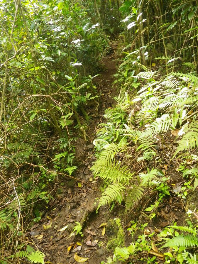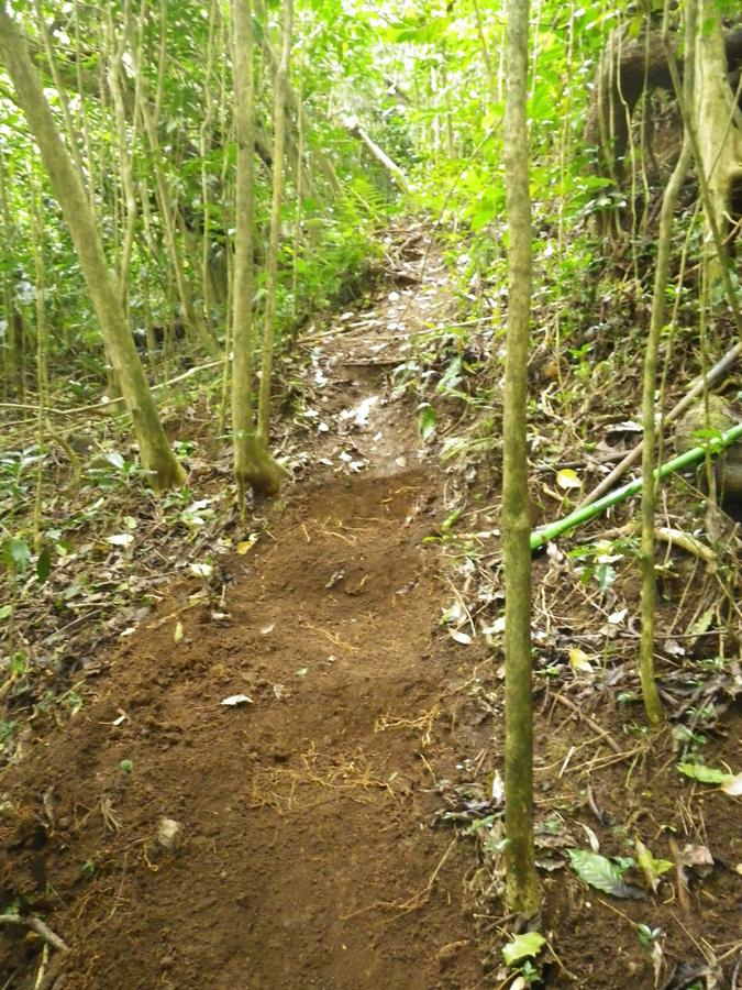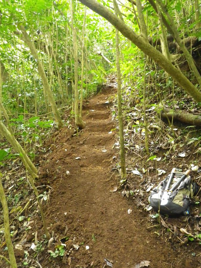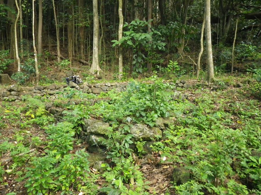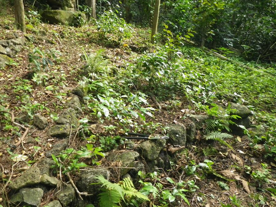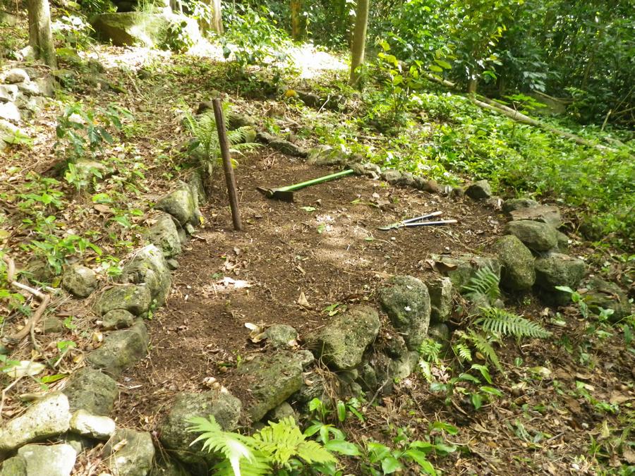 This is the place I planted the Lonomea tree. I took about 45 minutes to clear all the coffee, satin leaf, coral berry and thimble berry plants that were growing in this little triangular bed built by someone about 100 years ago.