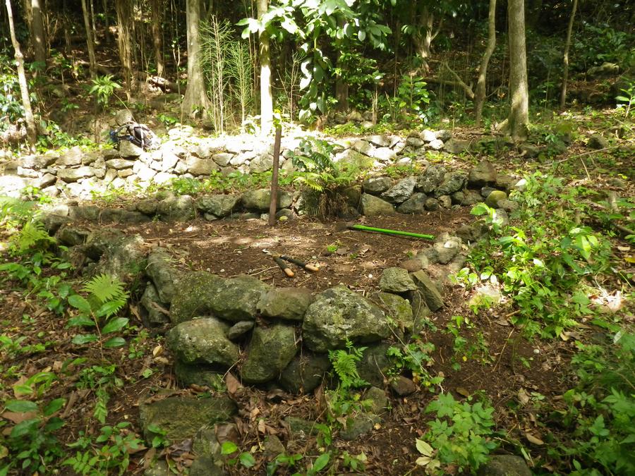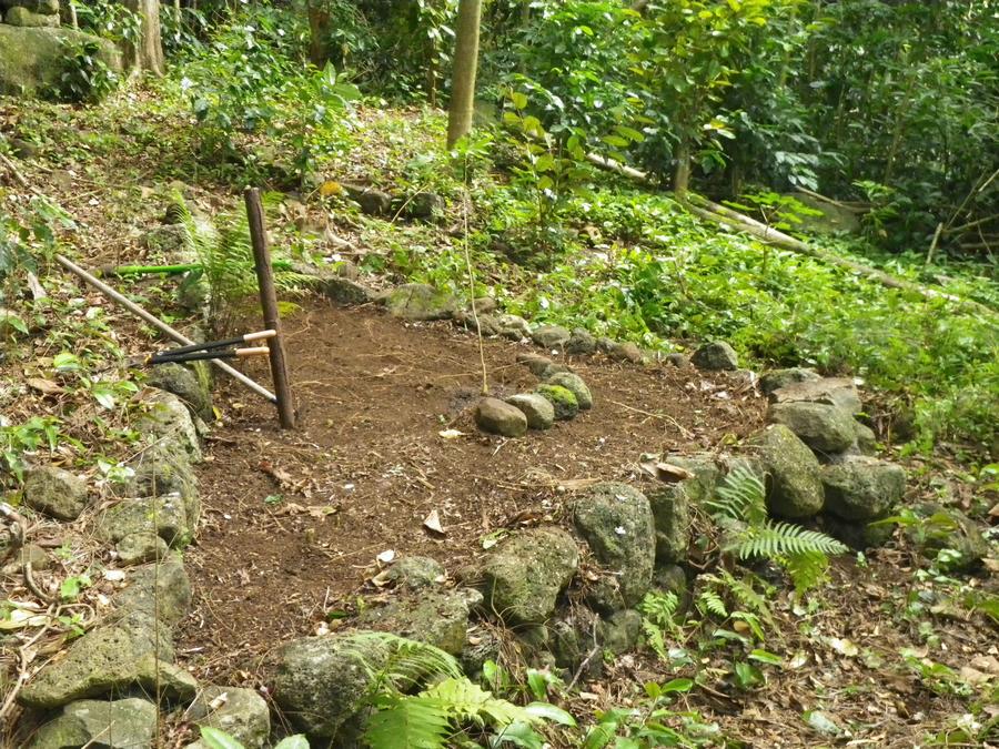 That vertical "thing" standing to the right of my loppers is an "O`o". It was made of a piece of water pipe. the low end was formed into a point and it can be used to dig holes in the ground. It is about 3.5' long and was found here when we first cleared the site a few years ago. Being so short I can only assume that the people who built and used it constructing the site were much shorter than me. I'm 6' tall.