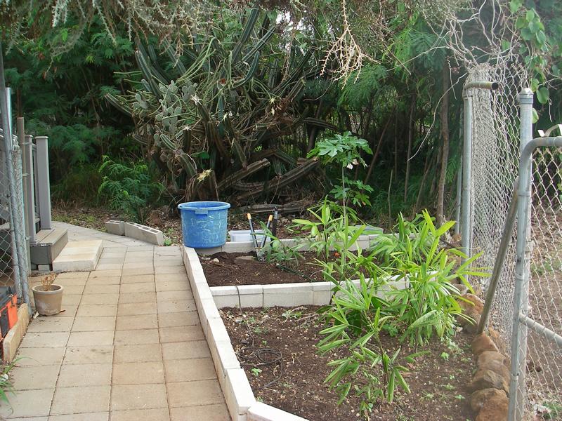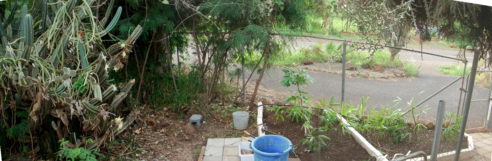 Here is a panorama from the stairs. That small tree in the left bed is a Brachychyton acerifoliens, or Australian Flame Tree, which should shade the yard in about 8 years.
