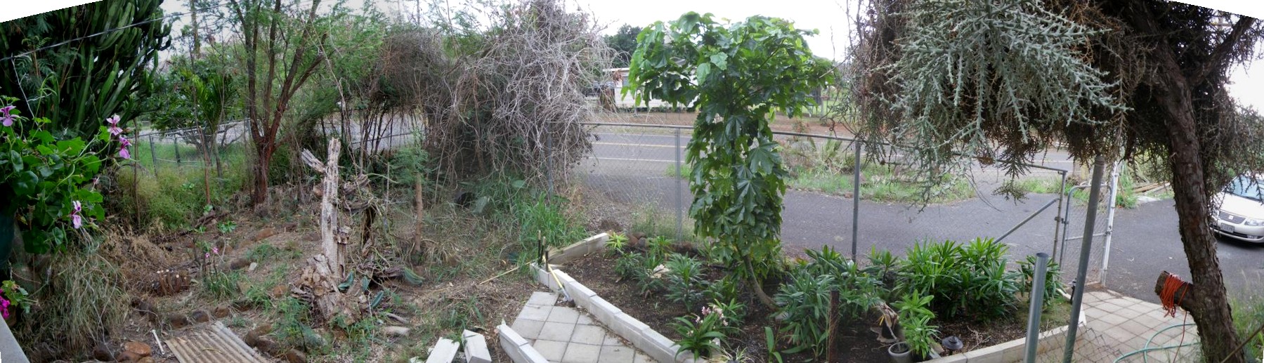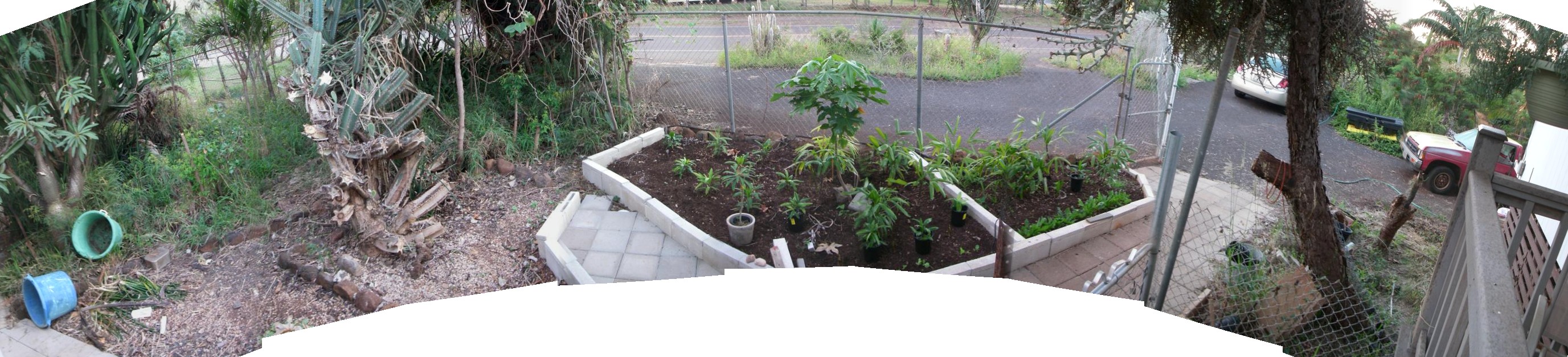 I have the palms out of the pots and in the ground now. Since January I have just been cutting back the giant night blooming cereus that was in the middle of the yard. The cuttings are heavy and the easiest way to get rid of them is to put them in the city supplied garbage can w/wheels. I then roll it out to the curb and they take care if it. One load of the cactus must weigh close to 100 lbs. On the left you can see some of the stone outlined beds from the very first picture on page one. In the center in a small cement pot is a Euphorbia we picked up a few weeks ago. It is a small tree know as Pride of Barbados, although the seller called it Pride of Jamaica. I believe it to be the same.
