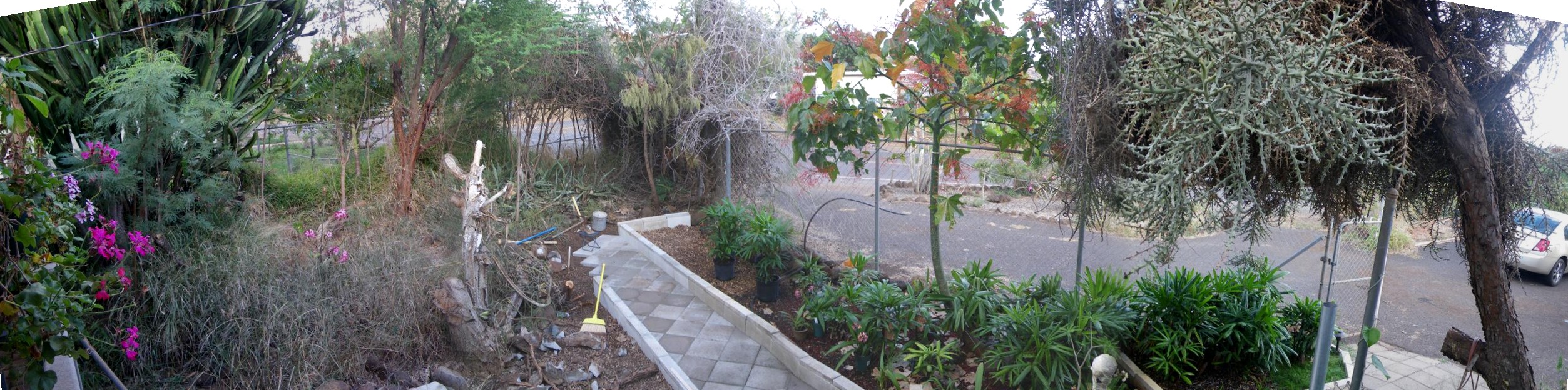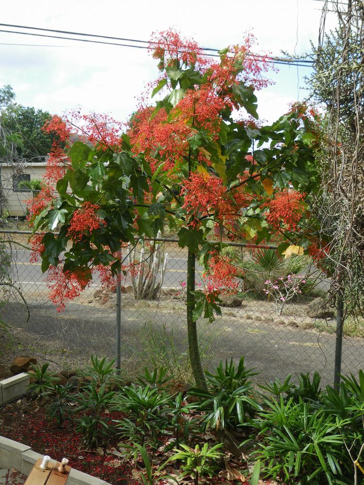 Check out the Australian Flame Tree. It sure has grown in two and a half years. This is the first year it's flowered.