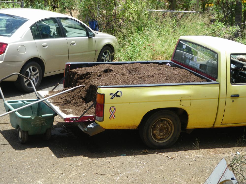 I've heard a lot of "Ford Tuff" in reference to their trucks. Well this is Nissan Tough. This is a 1991 Nissan p/u that I guess has a rating of 1/4 ton carring load. Well this is 1120 lbs of compost. Approx. 1 square yard. Total cost about $35.