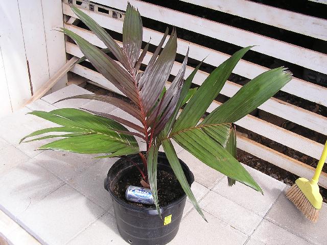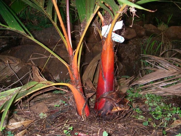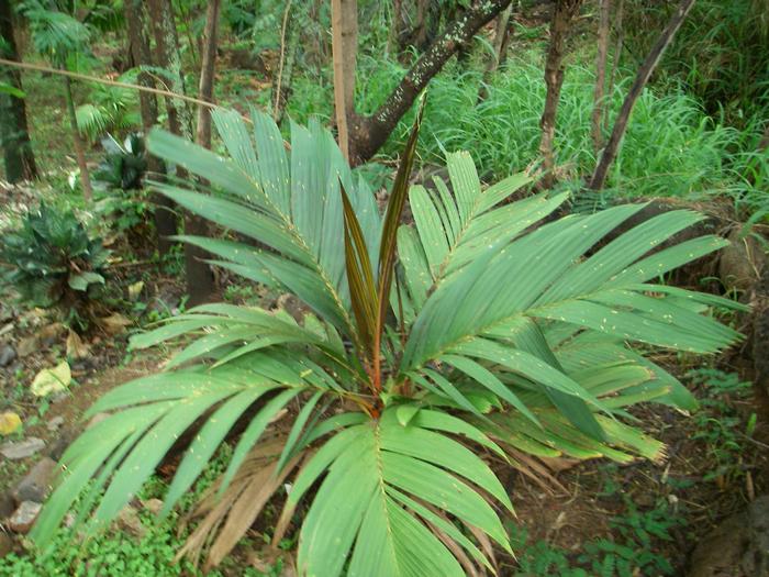 Native to low mountainous rain forests of Indonesia. Funny but it's doing well here in dry Wai`anae. Some are solitary, but this one is beginning to clump. It was sold at Home Depot as "Sunshine Palm".