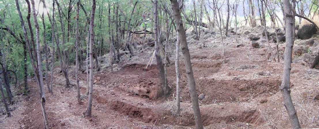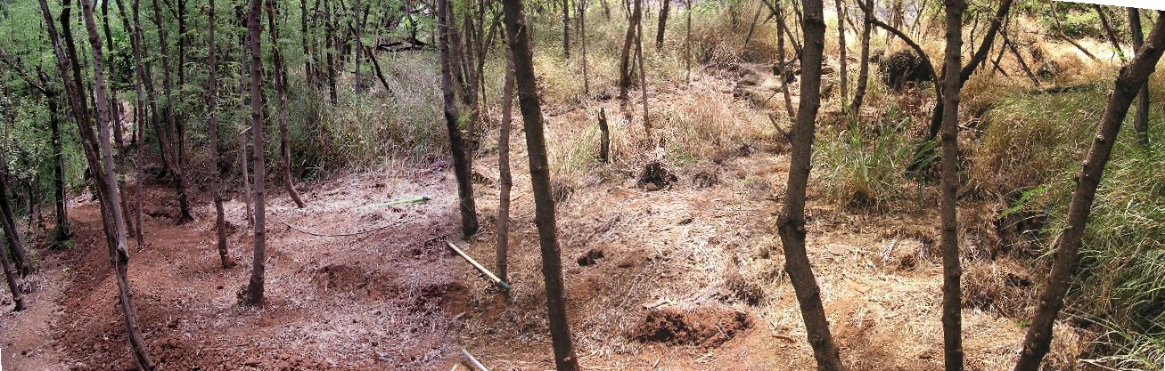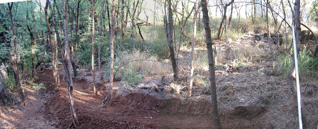 I'm now standing just above the Monkey Pod tree, on the edge of the drainage ditch. You can see the long narrow terraces I've cut into the hill side and the untouched area above. When I terrace I alternate with one pretty narrow for walking on and then one wider for planting. The lowest one here is a "walking" terrace and the upper a planting terrace. The planting terrace will get wider as I cut more into the bank.