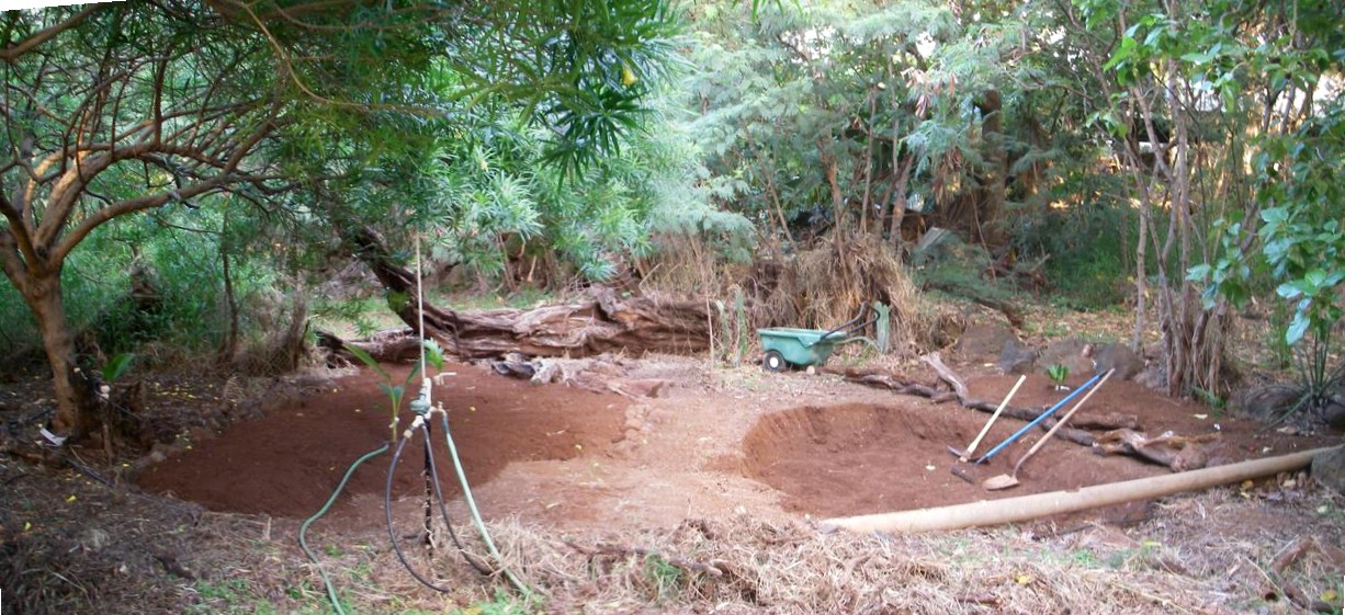 This time I move A LOT OF SILT. I used the little 4 wheeled wheel barrow to do the work. It is much easier to move around than one of those big one wheeled ones that always seem to want to tip to one side of the other. I really didn't finish this side as I wanted to leave room to move the wheel barrow from the back if needed. In the back ground is the trunk of a Keawe tree that I cut down many years ago. Sometimes a quick look at it makes me think of a long necked dinosaur. :-) Here on the left side of the stream I planed two more palms, one Archontophoenix purpurea (closest to the camera) and in the back one Burretiokentia hapala. Both of these will someday "punch" thru the cover of the Be Still Tree. Not sure how I'll handle that yet.