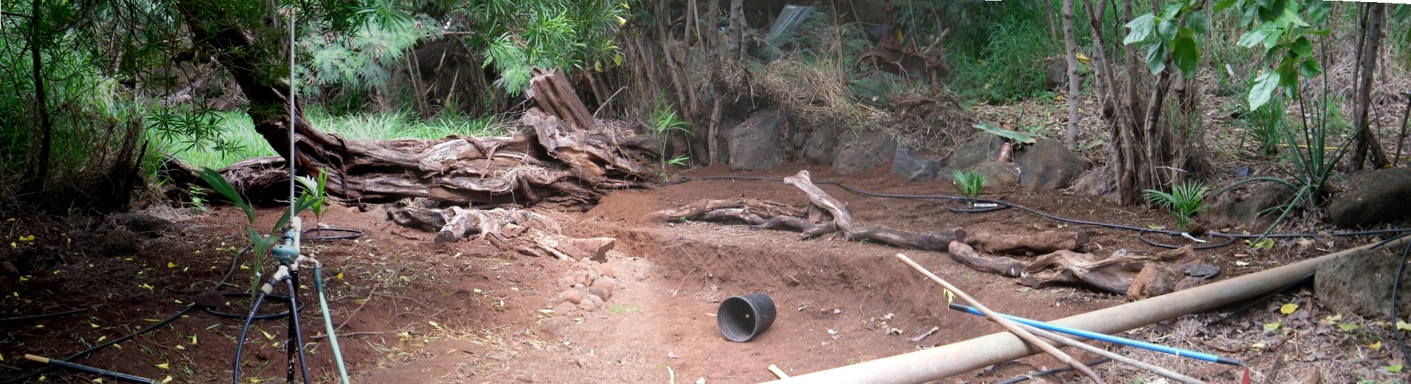 Today I went to work with pick shovel and rack and finished the bed on the right of the stream. There I planted the Euterpe. It's way in the back but not as close to the Keawe log as it looks. The joining of the two photos to make the panorama makes it look right by the log. It is about 4 feet away.