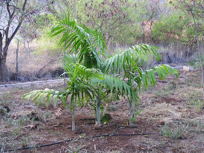 Dypsis pembana one years growth shown here and two additional plants added before I realized it was a clumping palm. Oh well should really form a big clump some day. The older one has a side shoot and so does the one on the right.