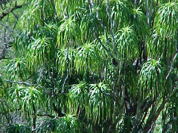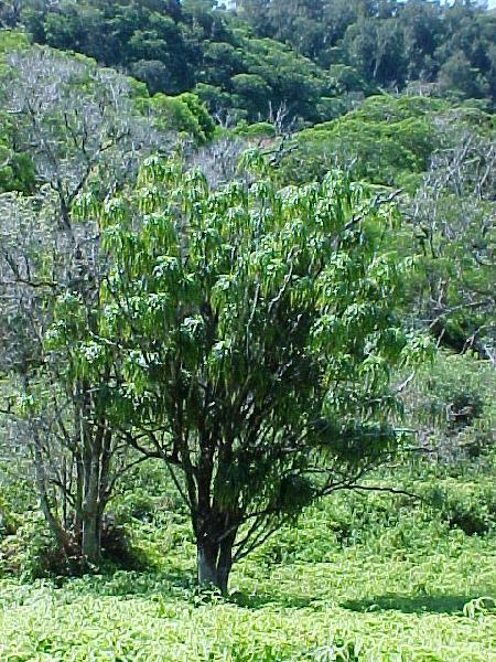 Below are pictures of the Halapepe tree that the trail is named for. We reached this point at 11:20 a.m. It belongs to the Genus Pleomele and I'm not sure of the species. There are three in the islands according to Samuel Lamb's book "Native Trees and Shrubs of the Hawaiian Islands". The wood is soft and was used to carve into idols. Branches were used to decorate the altars of the goddess Laka.