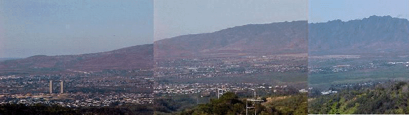 Farther down on the Halapepe Ridge we came to the open spot with great views. Here I'm pasting pictures to make a panorama. Not the best job, but what the heck. Its the southern part of the Wai`anae Mountains.